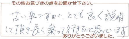 - 古い車ですが、とても良く説明して頂き長く乗って行きたいと思っています。