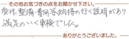 - 費用等納得の行く説明があり納得のいく車検でした。