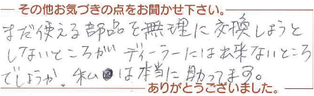 A様 まだ使える部品を交換しようとしないところがディーラーには出来ないところでしょうか。私は本当に助かってます。