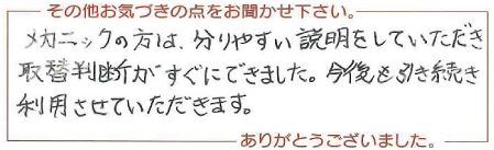 H様 メカニックの方は、わかりやすい説明をしていただき取替判断がすぐにできました。今後も引き続き利用させていただきます。