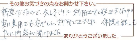 F様 新車だったので、久しぶりに利用させて頂きましたが安い費用でも安心して利用できました。保険の話も良い内容が聞けました。