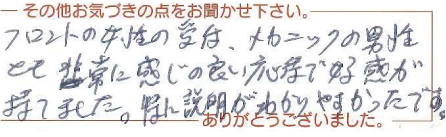 G様 フロントの女性の受付、メカニックの男性とも非常に感じの良い対応で交換が持てました。特に説明がわかりやすかったです。