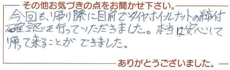 K様 今回も、帰り際に目前でタイヤ・ホイールナットの締付確認を行っていただきました。本当に安心して帰って来ることができました。