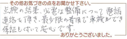 T様 点検の結果、必要な整備について電話連絡を頂き、最小限の費用で車検ができ保証も付いて安心です。