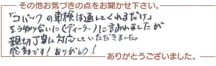 S様 「コバックの車検は通してくれるだけ」と知り合い(ディーラー)に言われましたが親切丁寧に対応していただきました。感動です!ありがとう!