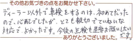 O様 ディーラー以外で車検をするのは、初めてだったので心配でしたが、とても親切でていねいな対応でよかったです。今後の点検も是非お願いしたいです。